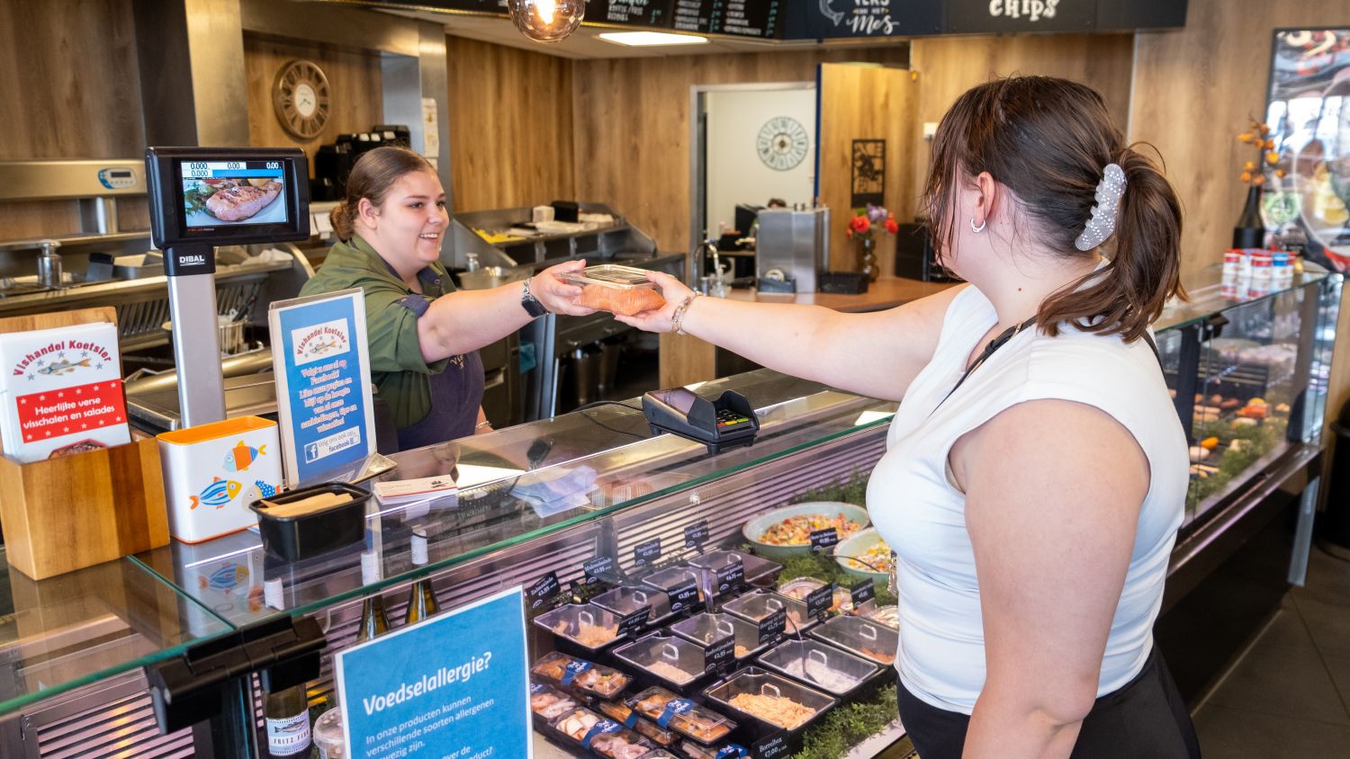 Marja Koetsier is al jaren lang het gezicht van de Vishandel, ze ontvangt dan ook graag haar klanten en staat ze altijd te woord mochten er vragen zijn. Vishandel Koetsier is inmiddels een begrip in Klazienaveen en omstreken, wij kunnen aan al uw wensen voldoen op het gebied van vis. Van de hollandse nieuwe, tot een bakje kibbeling, tot luxueuze visschotels, we hebben het allemaal!